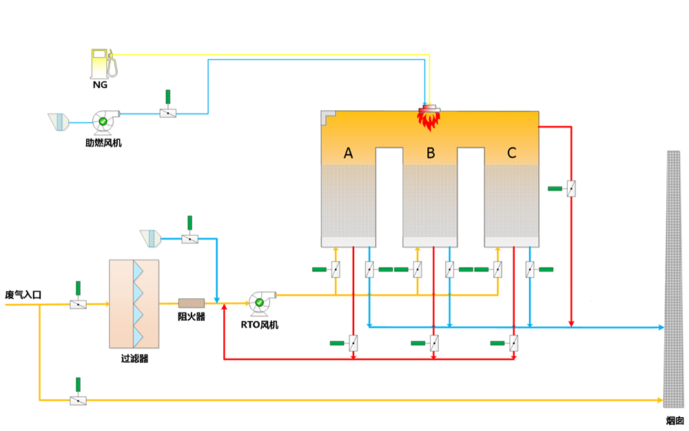 蓄熱式熱氧化爐(RTO)具有熱效率高(≥95%)、運行成本低、能處理高濃度廢氣等特點,濃度稍高時,還可進行二次余熱回收,大大降低設備運行成本。三床RTO主要由陶瓷蓄熱床、燃燒室、內保溫、燃燒系統及電氣控制系統等組成。把有機廢氣加熱到760℃(具體需看成分)以上。在高溫下,廢氣中的有機物(VOCs)被氧化、分解成二氧化碳和水。氧化產生的高溫氣體流經特制的陶瓷蓄熱體,使陶瓷體升溫而"蓄熱",此"蓄熱"用于預熱后續進入的有機廢氣,從而節省廢氣升溫的燃料消耗。陶瓷蓄熱室應分成兩個(含兩個)以上,每個蓄熱室依次經歷蓄熱→放熱→清掃等程序,周而復始,連續工作。蓄熱室"放熱"后,應立即引入適量潔凈空氣清掃蓄熱室,以保證VOC去除率在99%以上。只有待清掃完成后,才能進入"蓄熱"程序;否則,殘留的VOCs隨煙氣排放到煙囪,從而降低處理效率。