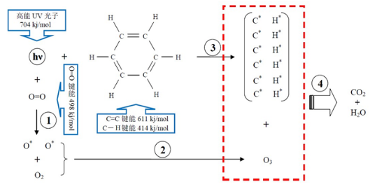 ②利用高能高臭氧UV紫外線光束分解空氣中的氧分子產生游離氧,即活性氧,因游離氧所攜正負電子不平衡所以需要與氧分子結合,進而生產臭氧:UV+O2→O-+O*(活性氧)、O+O2→O3(臭氧)。臭氧對紫外線光束照射分解后的有機物具有極強的氧化作用,對廢氣及其它刺激性異味有良好的削除效果。